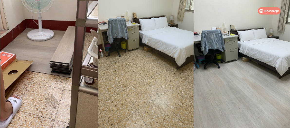 老舊教師宿舍地板髒又難清潔,屋主決定自己動手鋪設地板。雖然一開始切割有點困難,但逐漸上手,整體質感明顯提升。